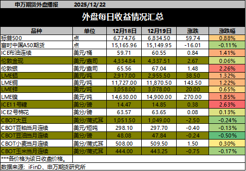 股指:美国三大指数上涨,上一交易日股指上涨,商贸零售板块领涨,银行板块领跌,市场成交额1.75万亿元。资金方面,12月18日融资余额减少33.24亿元至24825.56亿元。在制度进一步完善、资金再度扩容、产业持续赋能等多重维度利好下,A股的长牛慢牛格局有望得到巩固,形成 “政策托底、资金护航、产业驱动” 的三重共振。12月美联储如期降息有望再度提升全球资本流向与风险偏好,资本市场持续改革将进一步巩固慢牛基础。随着12月重要会议基调逐步落地,积极政策信号与美联储降息形成共振,市场风险偏好有望再度提升。