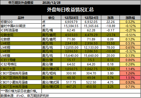 股指: 美国三大指数上涨,上一交易日股指上涨,国防军工板块领涨,农林牧渔板块领跌,市场成交额1.90万亿元。资金方面,12月22日融资余额增加148.59亿元至25145.96亿元。在制度进一步完善、资金再度扩容、产业持续赋能等多重维度利好下,A股的长牛慢牛格局有望得到巩固,形成 “政策托底、资金护航、产业驱动” 的三重共振。12月美联储如期降息有望再度提升全球资本流向与风险偏好,资本市场持续改革将进一步巩固慢牛基础。随着12月重要会议基调逐步落地,积极政策信号与美联储降息形成共振,市场风险偏好有望再度提升。