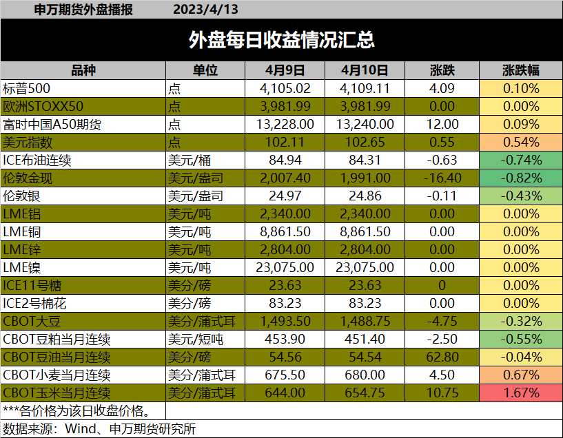 国际方面,美国3月CPI同比上升5%,预估为5.1%,前值为6.0%;美国3月CPI环比上升0.1%,预估为0.2%,前值为0.4%。互换市场显示到年底美联储基准利率料比当前低50个基点。纽约联储主席威廉姆斯表示将继续加息,但如果通胀下降,美联储将需要降低利率。美国能源部长Granholm:美国计划补充战略石油储备。美国想让战略石油储备回到俄乌冲突前的水平。美国至4月7日当周EIA原油库存增加59.7万桶。国内方面,融创中国在4月12日晚间公告称,复牌指引已满足,将在4月13日上午9时起于联交所恢复买卖。在资本市场率先恢复正常,是融创经营恢复正轨的标志性事件。重点商品:原油,白银,螺纹。