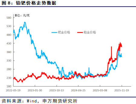 期货市场落地填补风险管理空白,提升中国定价话语权。2025年11月,广期所铂、钯期货和期权正式获批上市,结束了中国铂钯市场长期缺乏本土定价工具的历史。这一举措不仅为产业链企业提供了价格发现和风险对冲渠道,更有助于改变“买全球、用国内、定价权在外”的被动局面,预计年成交量将达50-80万手,为实体企业提供稳定预期。