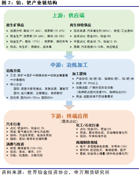 上游:供应高度集中,再生补充关键。铂、钯上游以原生矿开采和再生回收为核心,供应呈现“全球垄断+再生缓冲”特征。原生矿资源98%集中于南非、俄罗斯、津巴布韦三国,钯金产量中俄罗斯(39.64%)与南非(38.05%)合计占比近80%,铂金则由南非主导(71%);中国储量仅占全球0.8%,且多为伴生矿,自给率不足5%。再生回收是重要补充,全球再生钯占总供应35%、再生铂占18%,主要来源于汽车催化剂回收(占比80%+),中国再生钯供应占比达38.7%,但回收体系规模化程度待提升。