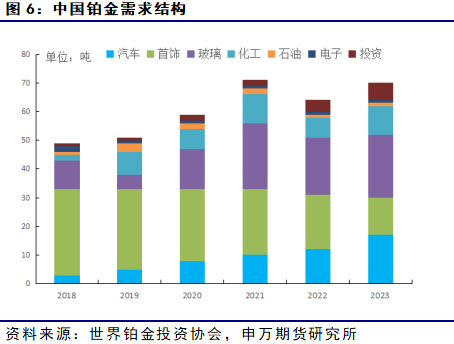 根据现有数据统计,中国的铂金年均需求量约为60吨。其中包含汽车、首饰、石油、化工、电子、玻璃、医药和投资等多个领域。其中占比最大的为首饰行业,年均占比接近50%,近些年呈现逐年下降趋势,2021年仅为35%。由于受到中国实施更加严苛的汽车排放标准,汽车领域的铂金用量呈现逐年增加的趋势。同时由于汽车、风电和5G等领域对玻璃纤维增强复合材料快速增长的需求,玻璃纤维行业进行大规模产能扩张,令中国玻璃行业的铂金需求呈现出较大幅度的增长。投资市场方面,世界铂金投资协会2017年进入中国市场后,在铂金投资市场推广和中国铂金产业链发展和完善上做出了巨大努力,中国铂条和铂币需求五年内增长了4倍。产品规格丰富,基本可以满足国内不同投资者的投资选择。投资者在产品规格选择中,500G以上占较大比重,大克重相对小克重价格升水小,更加具有投资的成本优势。