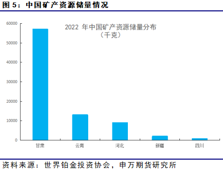 相对黄金和白银,中国包括铂金在内的铂族金属矿产资源储量都是比较匮乏的,这里的储量指的是探明资源量和控制资源量中可经济采出的部分。中国铂族金属储量不足全球0.1%,且几乎无独立铂矿,自有供应能力极度薄弱。根据国家自然资源部2023年6月发布的《2022年全国矿产资源储量统计表》显示,我国铂族金属矿产资源储量为80.9吨,只有黄金储量的2.58%。在区域分布和数量上也表现出极度不均和两级分化。铂族金属矿产资源主要集中在甘肃、云南几个省区。唯一规模化生产商甘肃金川集团2024年铂钯产量不足5吨,仅能满足国内3-5%的需求,矿产供应长期处于补充地位。我国的铂金矿藏储量不但总量低,相对世界其他地区也存在品位低的特点,这也导致我国铂族金属对外依存度非常高。作为全球最大消费国,2024年中国铂金消费量66.1吨(占全球26.7%)、钯金消费量58.9吨(占全球约20%),巨大的需求缺口高度依赖外部补给。